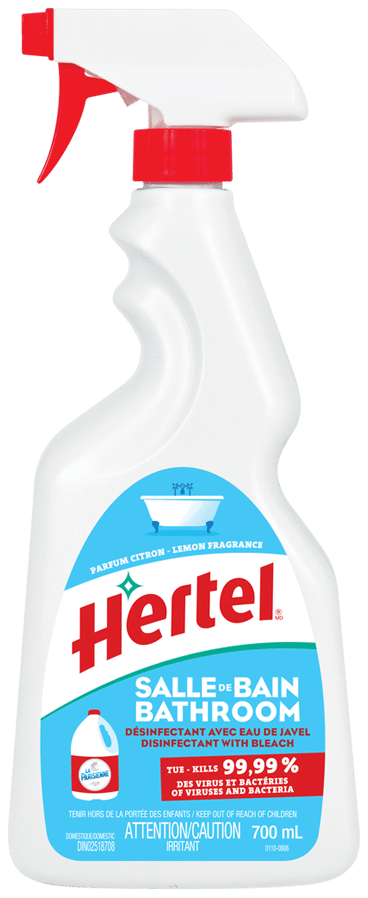 More than 340 bacteria can be found on your bathroom surfaces. What can you do? Hertel Disinfecting Cleaner with Bleach is a household cleaning product specially formulated to kill 99.99% of bacteria and viruses. It also kills fungus and germs that cause mold and bad odours. It removes stubborn stains and disinfects your entire bathroom, leaving behind a satisfyingly clean scent.